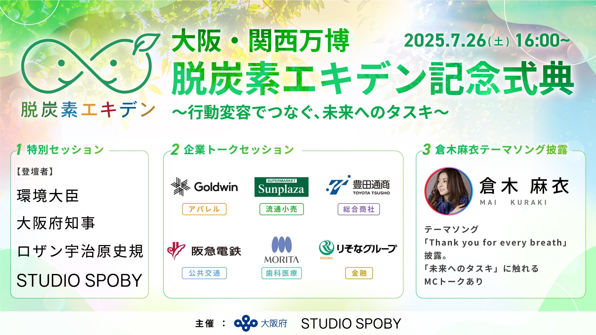 株式会社スタジオスポビー(本社:東京都中央区、代表取締役:夏目恭行)は、大阪府と共催で、2025年7月26日(土)、大阪・関西万博「大阪ヘルスケアパビリオン」公式ステージにて「脱炭素エキデン記念式典」を開催します。本式典では、環境大臣やGX推進企業6社をはじめとする登壇者が、脱炭素社会の実現に向けて“個人の行動”をいかに促進し、社会の価値へと転換するかをテーマに議論を展開します。