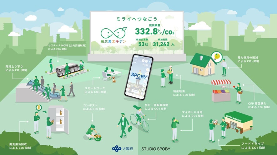 大阪府とスタジオスポビーは、脱炭素社会の実現に向けて、個人の行動変容に着目した全国型エコアクション「脱炭素エキデン」を2024年に立ち上げ、企業・自治体・市民が連携する新たな社会モデルの構築を進めてきました。2025年度は全国10都道府県で実施、計画が進むなど、その輪は確実に広がっています。