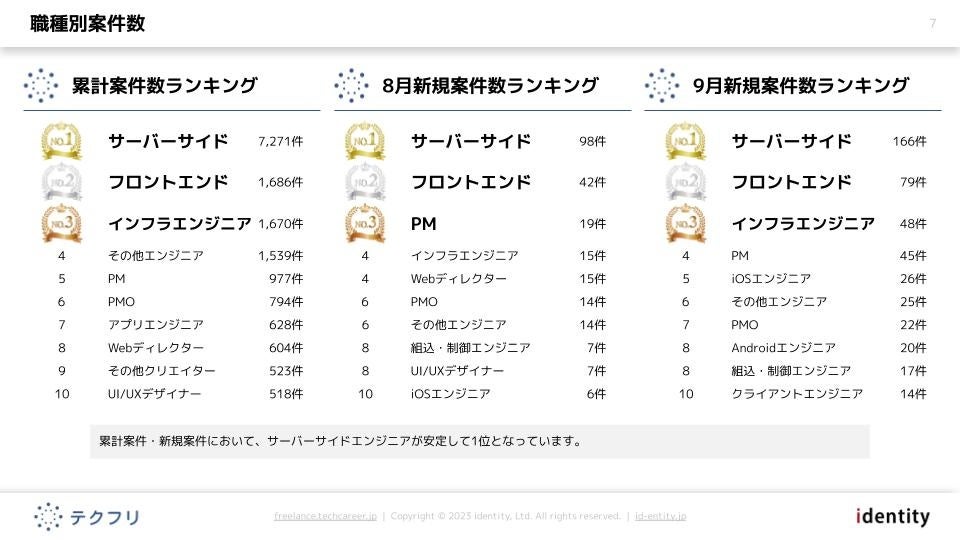 累計案件・新規案件において、サーバーサイドエンジニアが安定して1位となっています。