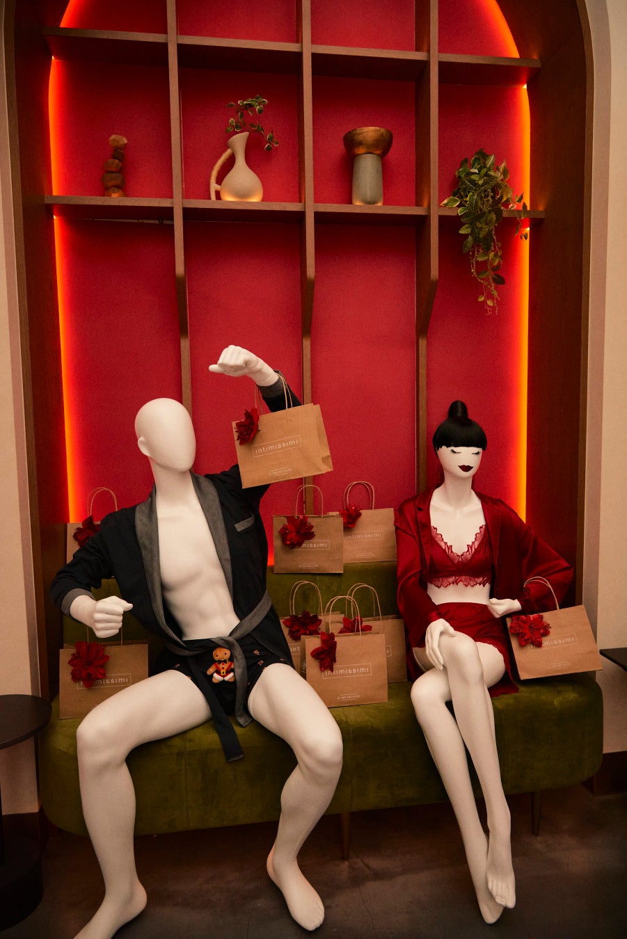 また、インティミッシミの煌びやかなホリデーコレクションが並べられたコーナーでは、ゲストたちがコレクションのテキスタイルやデザインに見入ったり、高品質のテキスタイルを実際に触ってその感触や、斬新でセンシュアルでありながらも、エレガントなホリデーコレクションを提供出来るインティミッシミのクラフツマンシップにあらためて感動し、さまざまなアイテムに身を包むマネキンを見て、楽しんでいました。