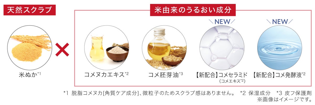 ユーザーから好評の“泡立ちの良さ”や“すっきり汚れを落とせるのにつっぱらない使用感”はそのままに、新たにコメセラミド*3、コメ発酵液*4の2種の米由来成分を追加配合。さらにキメ細かさがアップしたやさしいふかふか泡で、ざらつきやくすみ*5をすっきり落としながら、しっとりとうるおった透明感のある肌へ洗い上げます。毛穴やくすみ*5、乾燥にお悩みの方におすすめです。