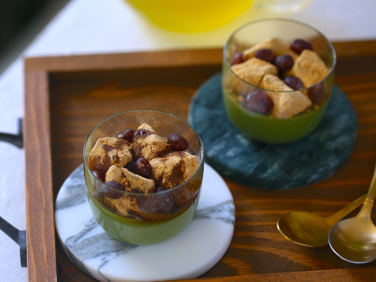 八女茶の特徴である『あまくてコクがあり、旨みの強い美味しいお茶』の味わいを活かしたこのプリンは、甘さ控えめで、抹茶の濃厚な旨味をしっかりと感じていただけます。また、炊いた小豆とわらび餅が飾られ、季節感を感じられる一品です。
