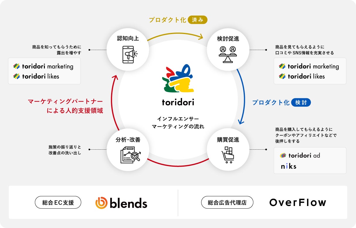 toridoriのディレクションの元、toridoriグループのniks(インフルエンサー特化の成果報酬型広告)、blends(総合EC支援)、OverFlow(ブランディング・総合代理店)が連携し、TikTok上で総合型のSNSコマース支援体制を構築し、EC企業のクライアント様を包括的にサポートいたします。