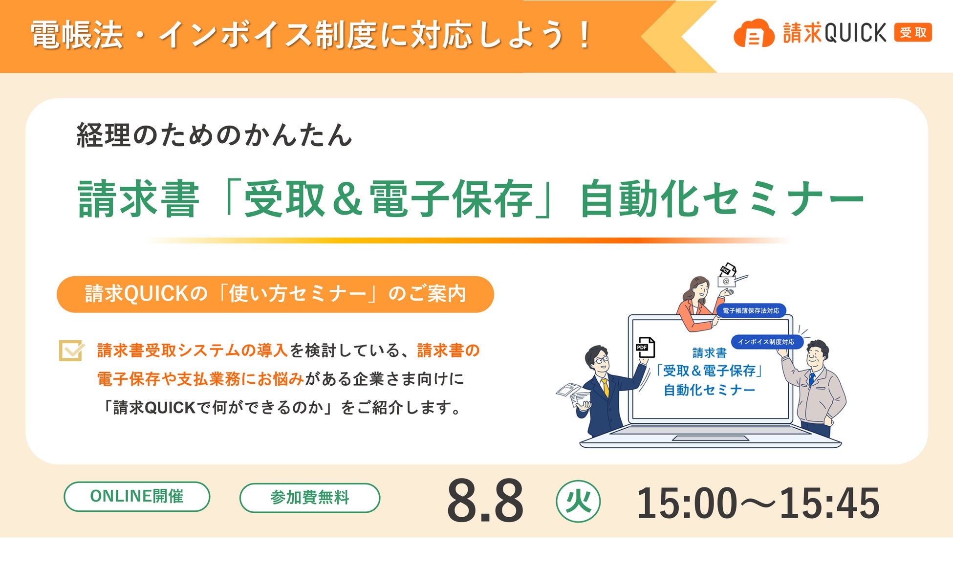 「請求QUICK」で電帳法・インボイス制度に対応しよう!経理のためのかんたん請求書「受取&電子保存」自動化セミナーを8月8日に開催