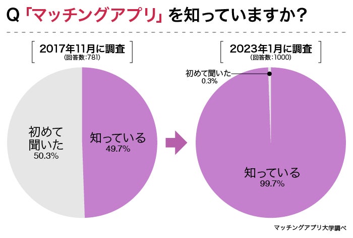 「マッチングアプリ」という言葉が世間に認知し始めた2017年ごろと2023年現在では、その認知度や好感度にどのような変化が起きたのでしょうか?