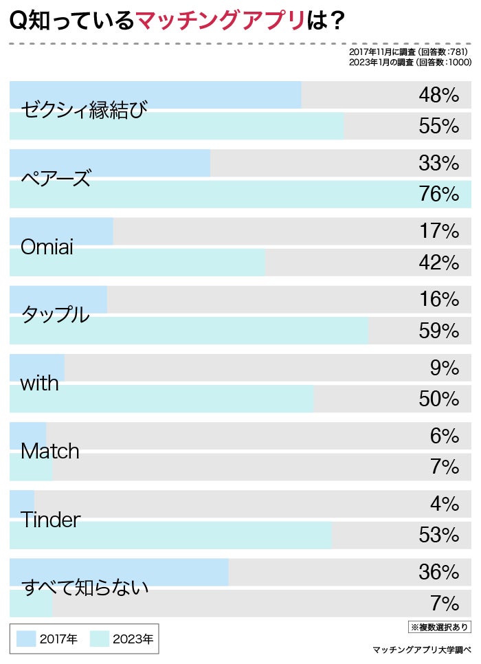 ●2017年から2023年の5年間で、マッチングアプリの認知度が約50%から100%にまでアップ