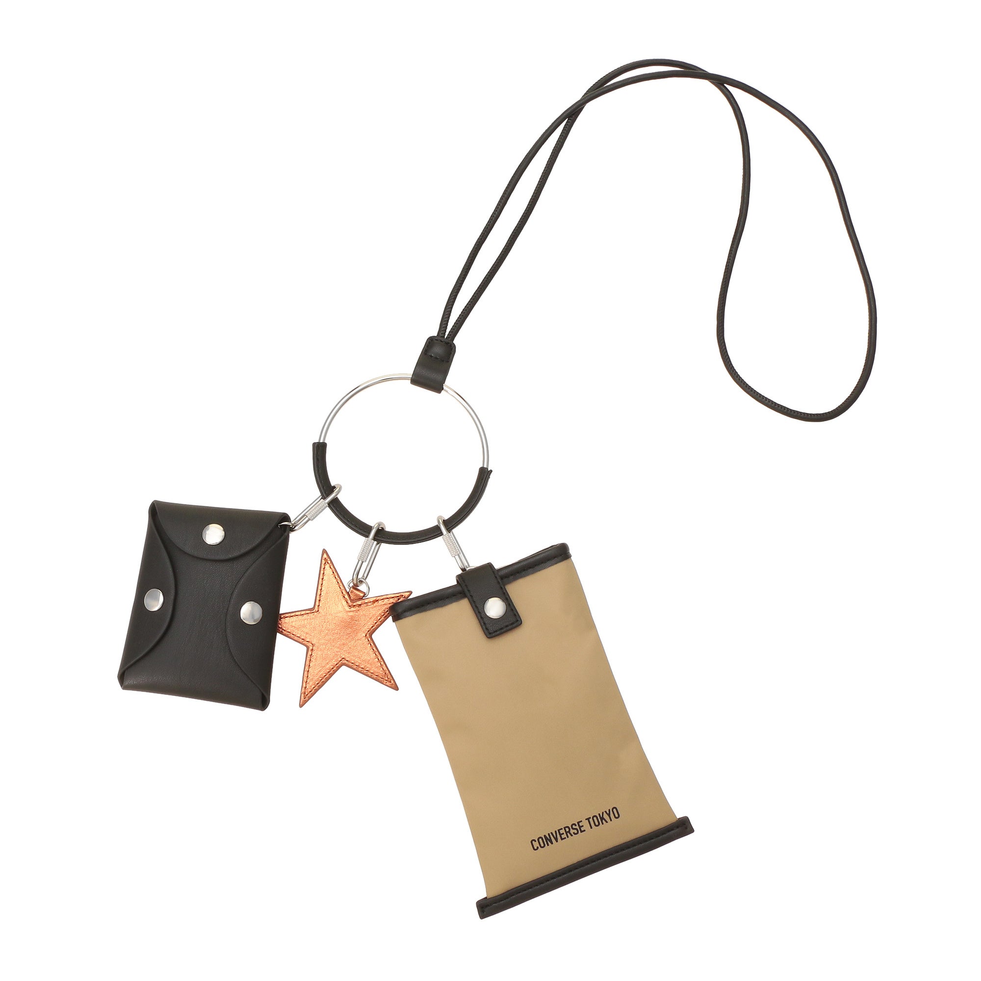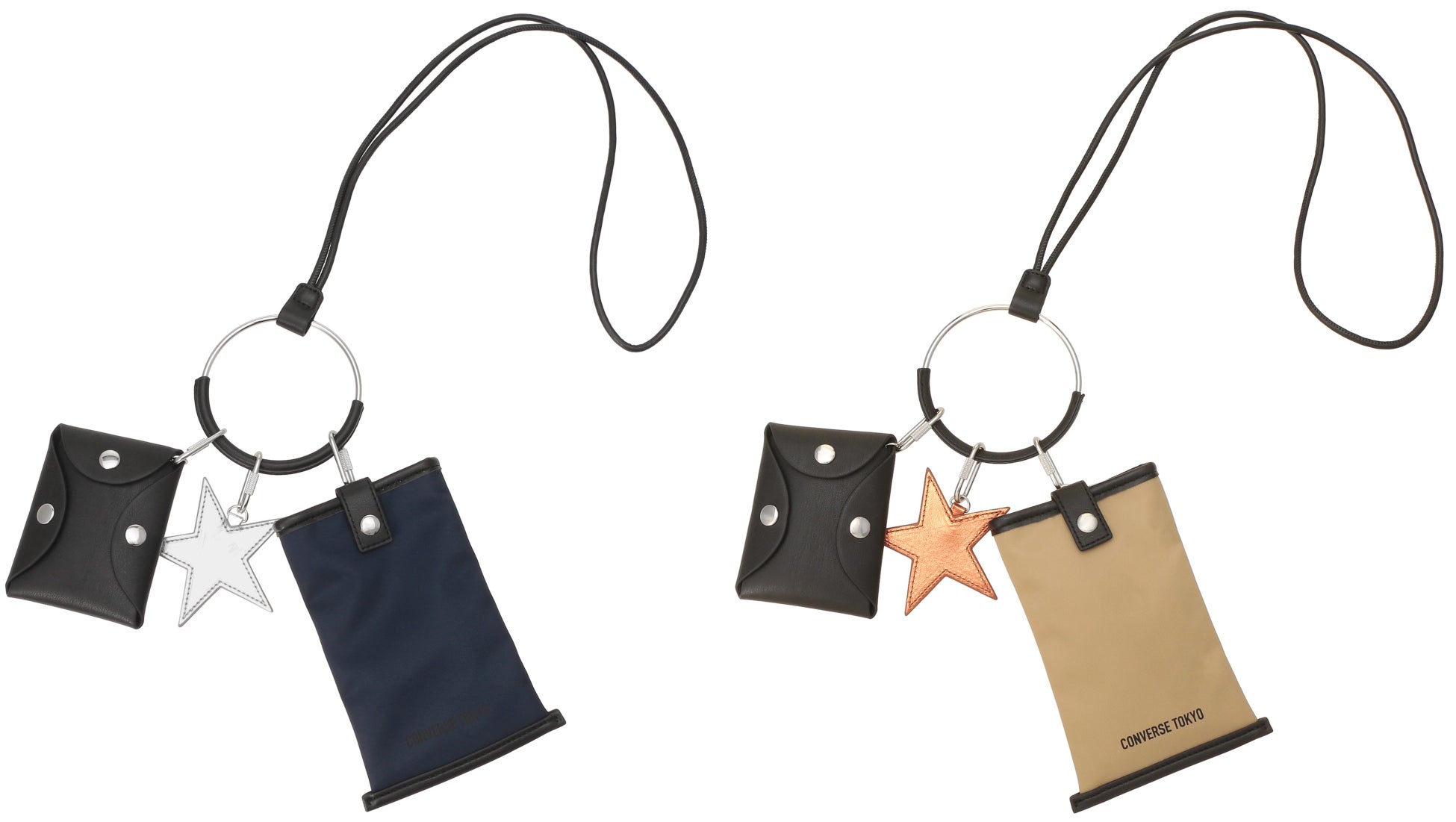 それぞれ取り外し可能な仕様で、自在にアレンジを楽しめます。ナイロン素材のスマホケースには、さりげなくCONVERSE TOKYOのロゴをプリントしました。エコレザーの小物ケースには、リザーブロゴがあしらわれています。夜空からインスピレーションを受けたネイビーカラーにはシルバーが輝き、ベージュカラーにはカッパー色の星型チャームがあしらわれ、それぞれに個性を添えています。