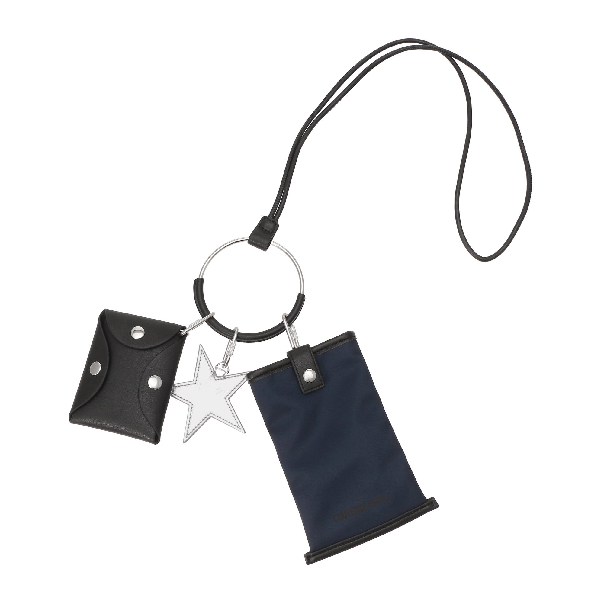 カードポケット付きのスマホケース、小物を収納できるミニケース、アクセントになるスターチャームの3つのアイテムがセットになった、トレンド感あふれるショルダーバッグです。