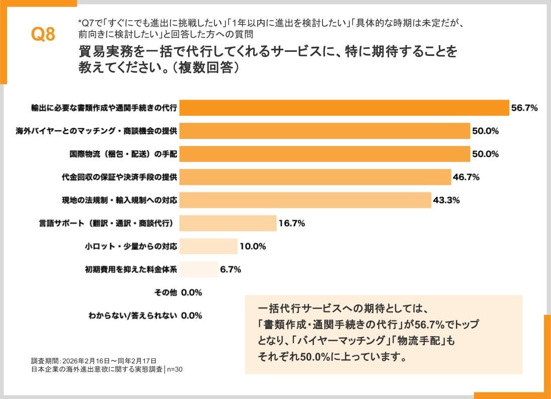 「Q8. Q7で「すぐにでも進出に挑戦したい」「1年以内に進出を検討したい」「具体的な時期は未定だが、前向きに検討したい」と回答した方にお聞きします。貿易実務を一括で代行してくれるサービスに、特に期待することを教えてください。(複数回答)」(n=30)と質問したところ、「輸出に必要な書類作成や通関手続きの代行」が56.7%、「海外バイヤーとのマッチング・商談機会の提供」が50.0%、「国際物流(梱包・配送)の手配」が50.0%という回答となりました。