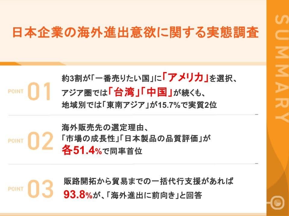 今回は、自社商材の海外販売に関心を持つ日本企業の経営者・海外事業担当者109名を対象に、日本企業の海外進出意欲に関する実態調査を実施しました。その結果、「今、一番売りたい国」はアメリカが約3割で最多となったほか、販路開拓と貿易の一括代行支援があれば約9割が海外進出に前向きになることが明らかになりました。