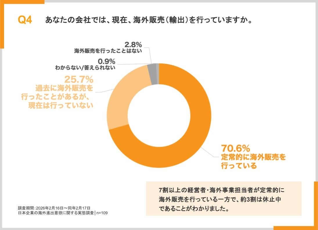 「Q4. あなたの会社では、現在、海外販売(輸出)を行っていますか。」(n=109)と質問したところ、「定常的に海外販売を行っている」が70.6%、「過去に海外販売を行ったことがあるが、現在は行っていない」が25.7%という回答となりました。