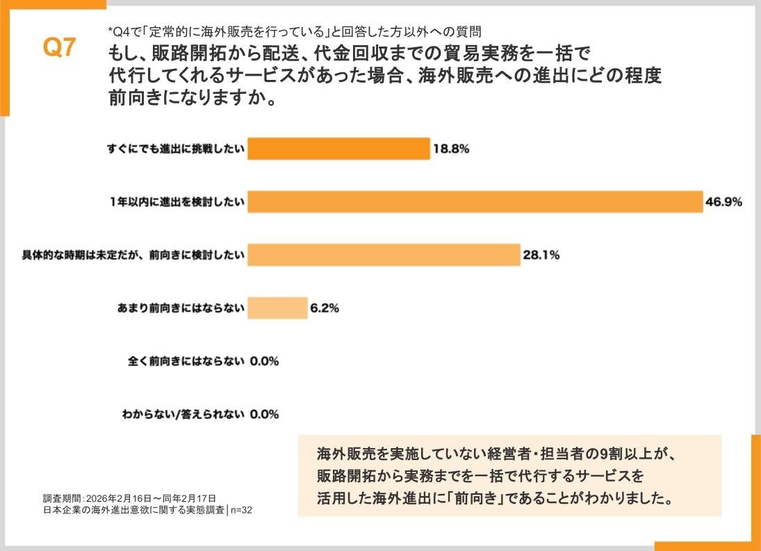「Q7. Q4で「定常的に海外販売を行っている」と回答した方以外にお聞きします。もし、販路開拓から配送、代金回収までの貿易実務を一括で代行してくれるサービスがあった場合、海外販売への進出にどの程度前向きになりますか。」(n=32)と質問したところ、「すぐにでも進出に挑戦したい」が18.8%、「1年以内に進出を検討したい」が46.9%という回答となりました。