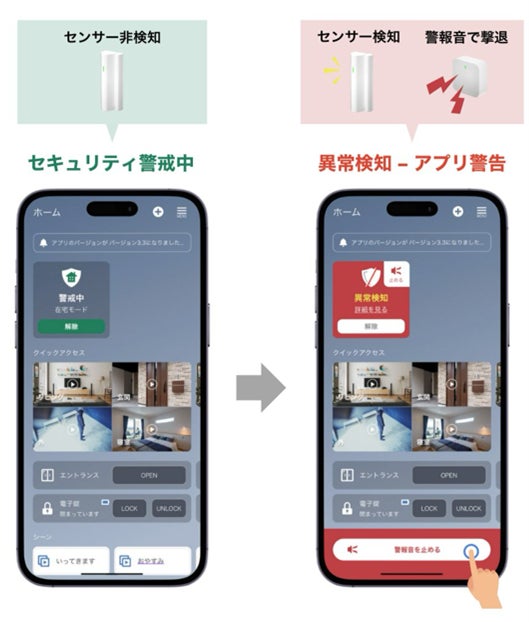 ホームセキュリティ機能*3をONにすると、警戒モードに切り替わります。この状態でドアや窓のセンサーが「CLOSE → OPEN」を検知すると、屋内サイレンが警報音を発し、在宅中の家族や近隣住民に異変を知らせます。さらに、スマートフォンに侵入通知が送信され、アプリ内に異常検知の表示が出ます。これにより、侵入者を撃退すると同時に、ユーザーに即座に侵入を知らせ、二次被害の防止にもつながります。