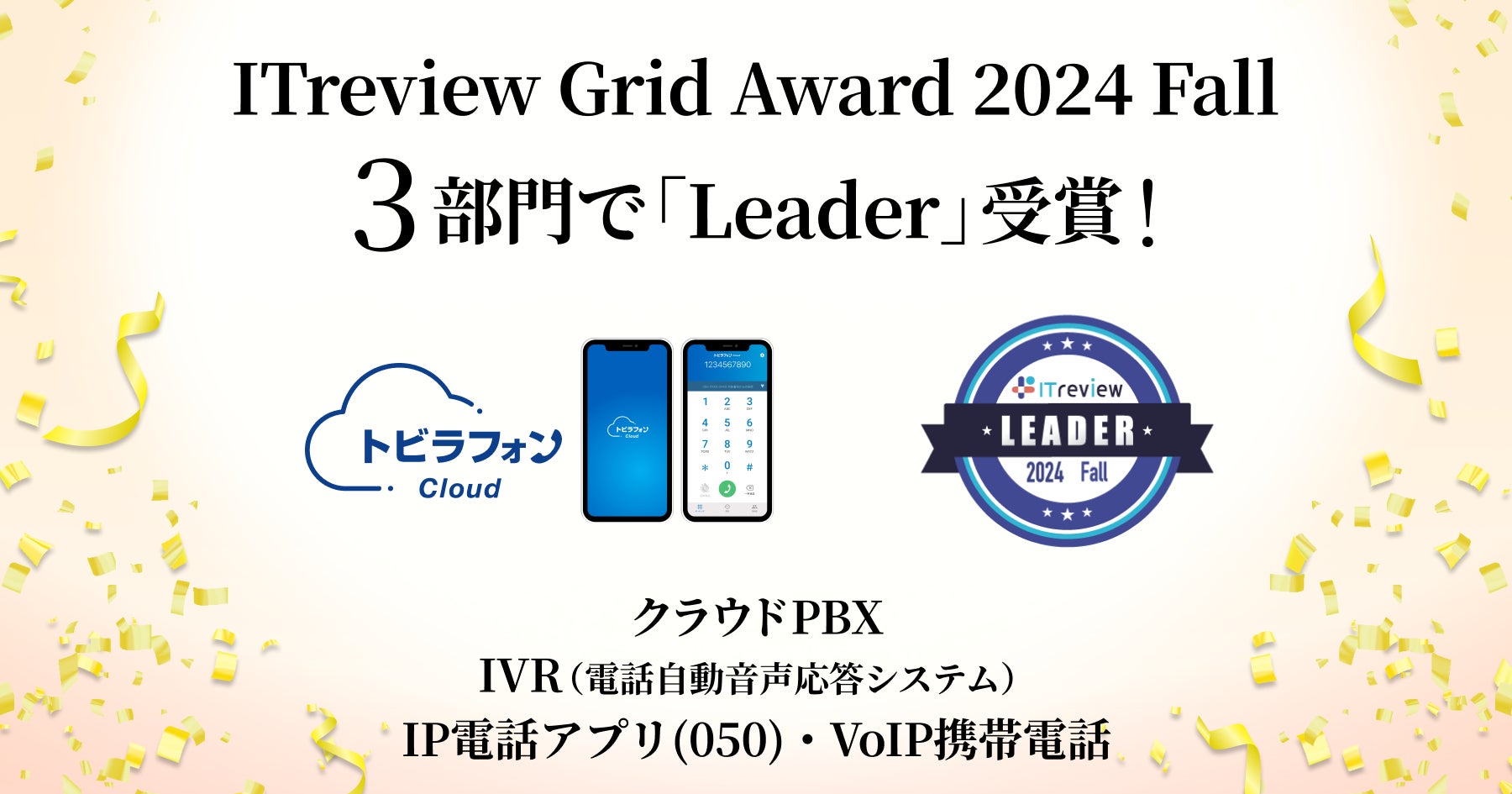 トビラシステムズ株式会社(本社:愛知県名古屋市、代表取締役社⻑:明⽥ 篤、以下「トビラシステムズ」)提供のクラウド型ビジネスフォン「トビラフォン Cloud」が、製品利用者の評価(レビュー)をもとに顧客満足度の高い製品を選定する「ITreview Grid Award 2024 Fall」のクラウドPBX部門、IVR(電話自動音声応答システム)部門、IP電話アプリ(050)・VoIP携帯電話部門の3部門で、最高位の「Leader」を受賞しました。