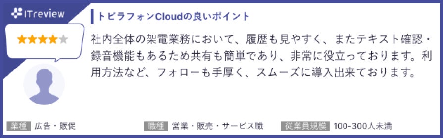 「トビラフォン Cloud」は「ITreview」で平均顧客満足度4.2を獲得しています(2024年10月16日時点 75レビュー)。当製品のご利用者様から実際に寄せられたレビューを一部ご紹介します。