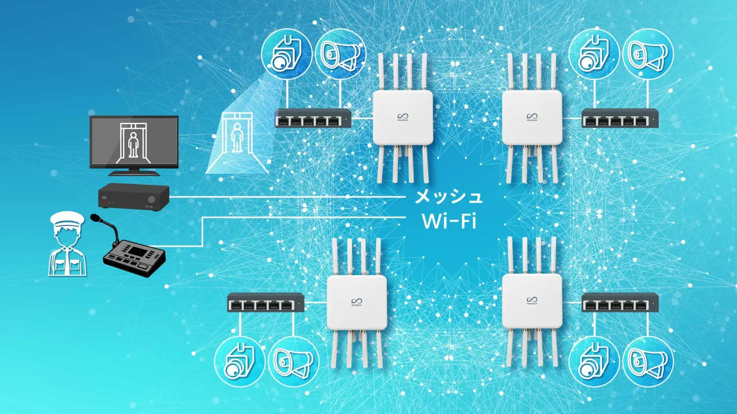 広大な敷地や既存施設において、確実な情報伝達(放送)や状況把握(映像監視)を行うには、LANケーブルの敷設工事が大きな障壁となります。PicoCELAの無線メッシュ技術を活用することで、配線工事を最小限に抑えつつ、TOAのIPオーディオやネットワークカメラを迅速に配置することが可能になりました。