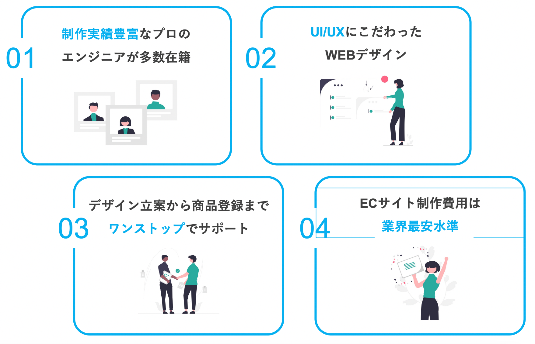 制作実績豊富なプロのエンジニアが多数在籍UI/UXにこだわったWEBデザインデザイン⽴案から商品登録までワンストップでサポートします。