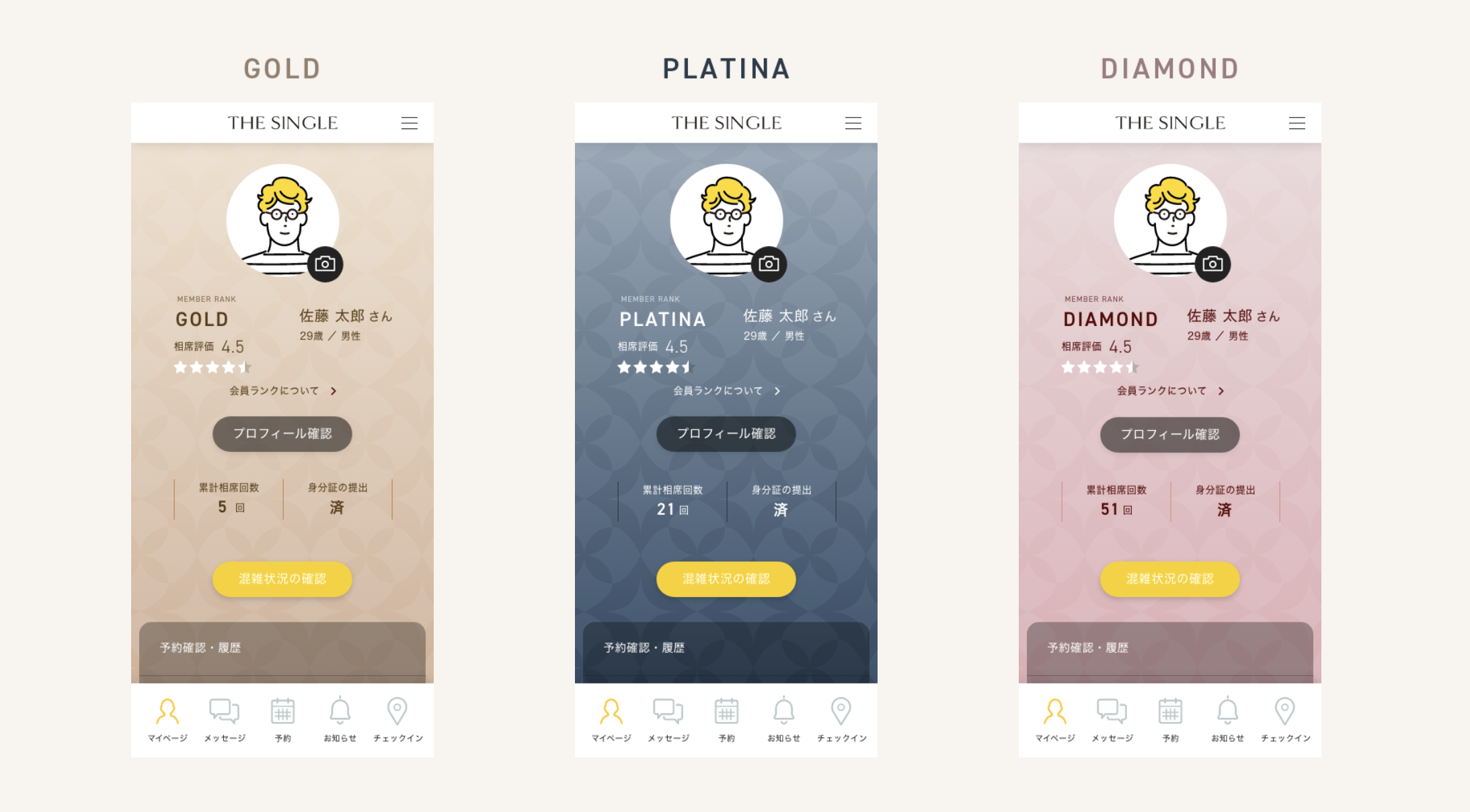 THE SINGLEはお客様に質の高い出会いを提供するために会員制となっており、ご来店前に会員登録が必要です。相席後に評価制度があるため、質の高い出会いが一定可能ですが、今回、たくさんのお客様からの声をもとに、よりお客様同士のマッチングを高めることを目的に会員ランク制度を導入いたしました。