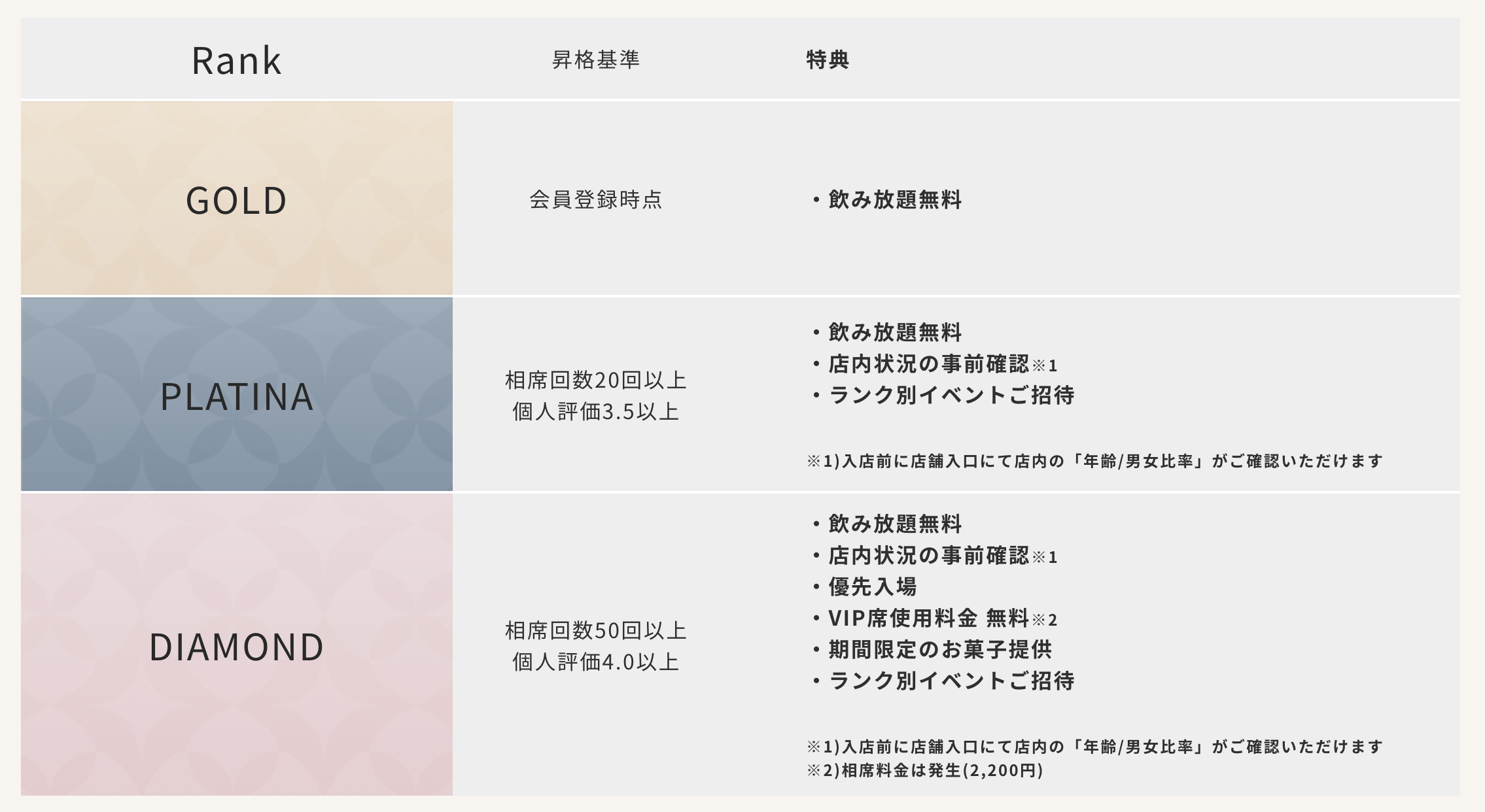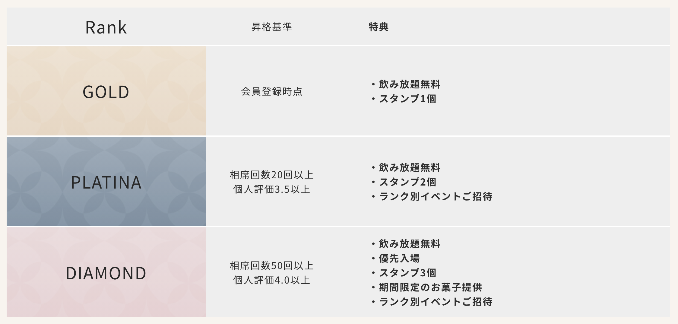 お客様の会員ランクが上がると、さらに希望に近い相席ができるようにランクに応じた限定イベントにご招待いたします。また、会員ランクはお客様の来店回数や評価などのステータスに応じて自動的にランクアップダウンが行われます。