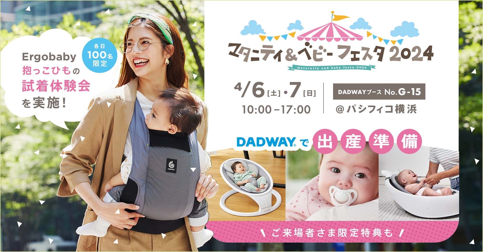 株式会社ダッドウェイ(本社:神奈川県横浜市、代表取締役社長:大野 浩人)は、2024年4月6日(土)・7日(日)に、パシフィコ横浜にて開催される『マタニティ&ベビーフェスタ2024』に出展します。