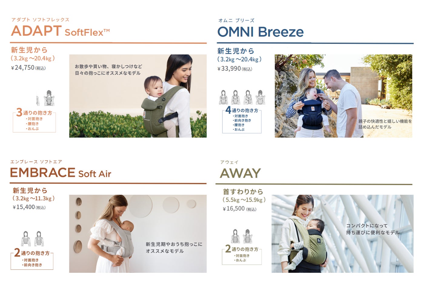 「OMNI Breeze(オムニ ブリーズ)」「ADAPT SoftFlex(アダプト ソフトフレックス)」「EMBRACE Soft Air(エンブレース ソフトエア)」「AWAY(アウェイ)」の4つのモデルが試着可能。専門スタッフがお客さまのライフスタイルに合わせた抱っこひもをご紹介します。