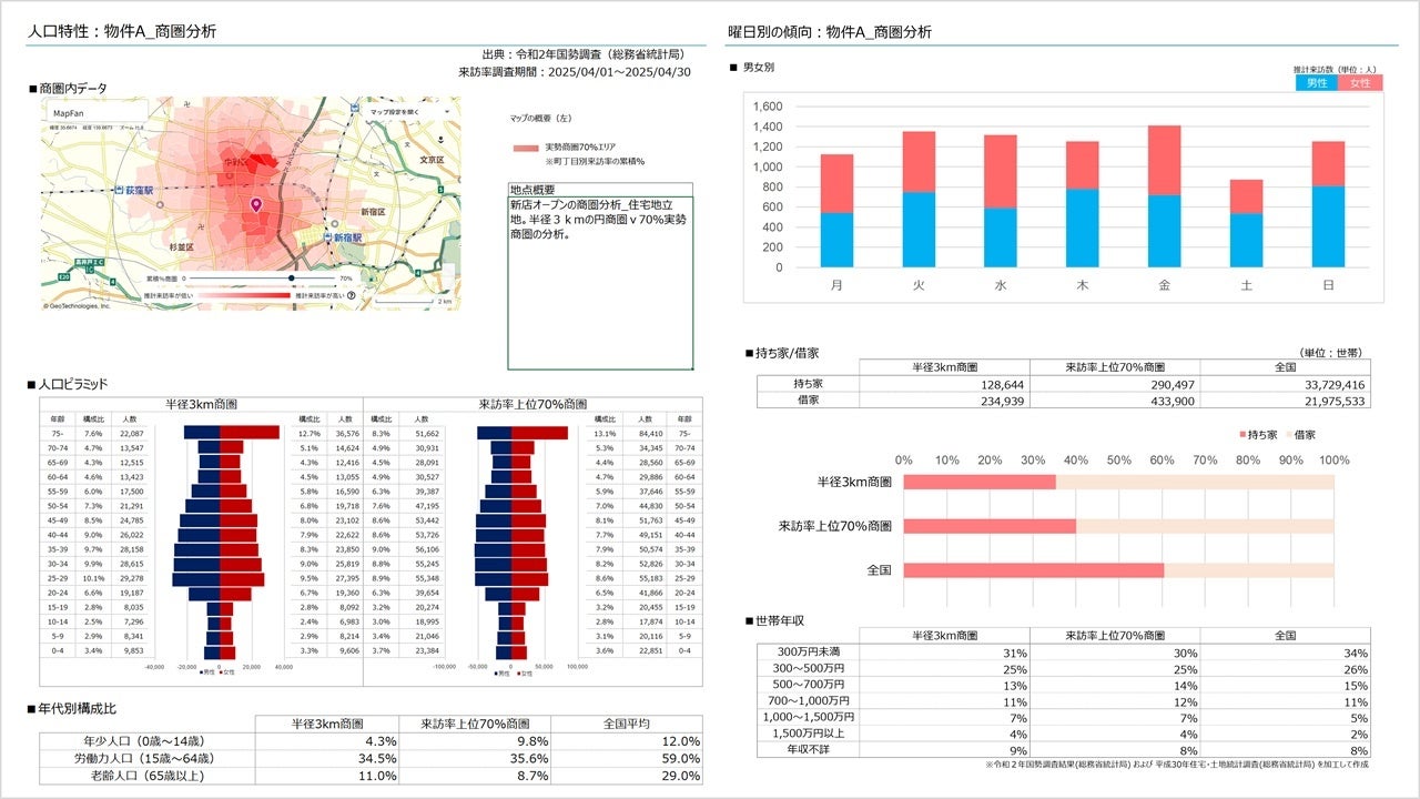 オフライン顧客のリアルな動向を可視化する人流データの活用は進む一方で、社内会議や商談資料への落とし込みには依然として大きな手間がかかっています。特に、国勢調査ベースの従来型「近隣エリア分析(商圏分析)」と、人流ログに基づく「実来店エリア分析(実勢商圏)」を併せてレポート化する際には、地図をスクリーンショットで切り出したり、グラフを手作業で再現したりといった作業が必要でした。