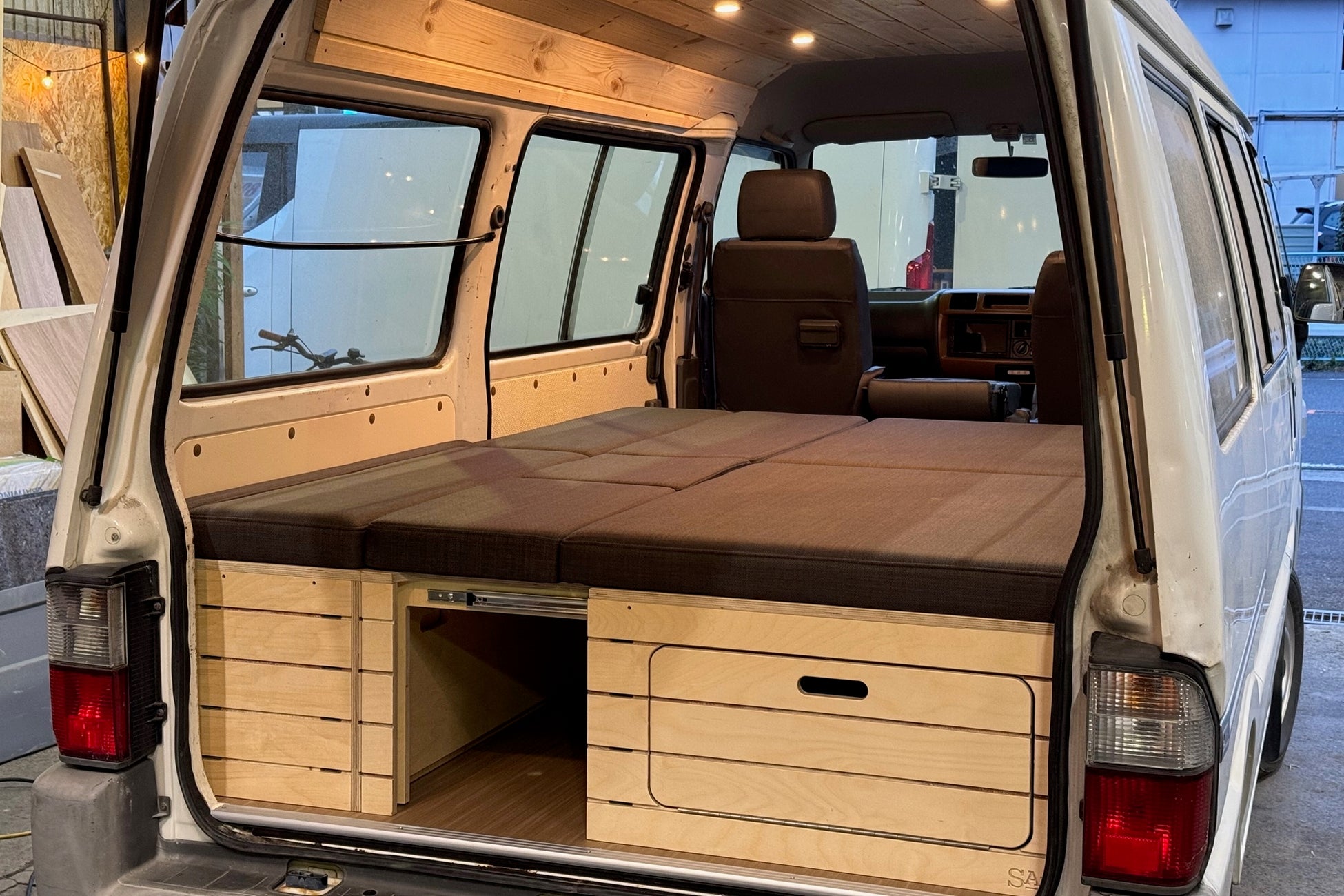 「SAny.VAN」は業界内で安価で、高いデザイン性に加え、個々の需要に合わせてヒーターやソーラーパネルなどの追加装備をオプションとして選択することも可能で、レイアウトの自由度と拡張性が高いキャンピングカーです。内装には車中泊可能なソファベッド、シンク、バッテリー、照明などを標準搭載。新車だけでなく、中古車の仕入れから、持ち込み車両のハイエースなどをキャンピングカーに改修・改造することが可能です。