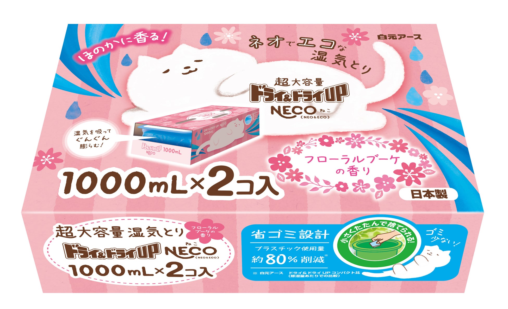 白元アース株式会社(本社:東京都台東区、社長:吉村一人)は、超大容量の1000mLを除湿できて、環境にもやさしい省ゴミ設計の除湿剤『ドライ&ドライUP NECO(ねこ) フローラルブーケの香り 1000mL』を2月1日より新発売いたします。