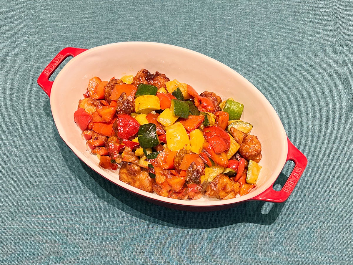 鶏肉と夏野菜をすっきりとした甘酢ソースに絡めた夏野菜がおいしく食べられる一品です。