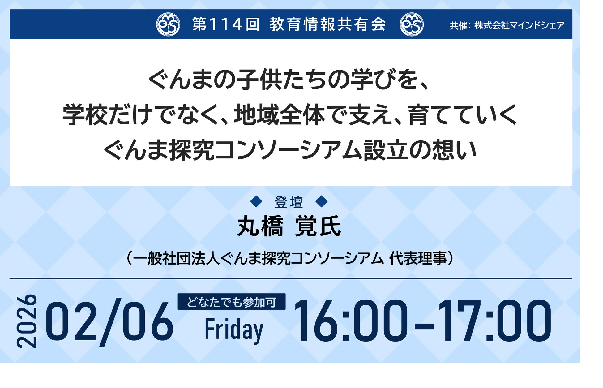 第114回教育情報共有会では、「ぐんまの子供たちの学びを、学校だけでなく、地域全体で支え、育てていくぐんま探究コンソーシアム設立の想い」というテーマで丸橋 覚代表理事よりお話いただきます。