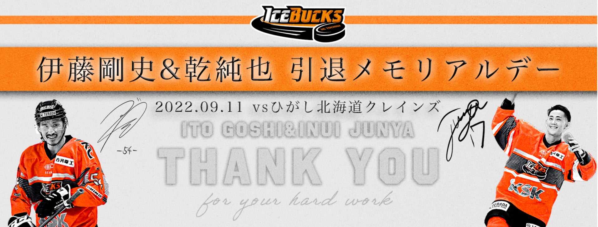 H.C.栃木日光アイスバックスは、2022年9月11日(日)開催の アジアリーグ アイスホッケー2022-2023 日光シリーズ、ひがし北海道クレインズ戦を「伊藤 剛史乾純也引退メモリアルデー」として開催します。