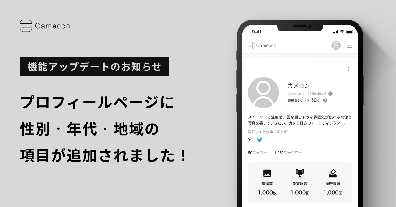 【新機能追加のお知らせ】フォトコンテストアプリCamecon(カメコン)のプロフィールに性別・年代・地域の項目が新たに追加されました!