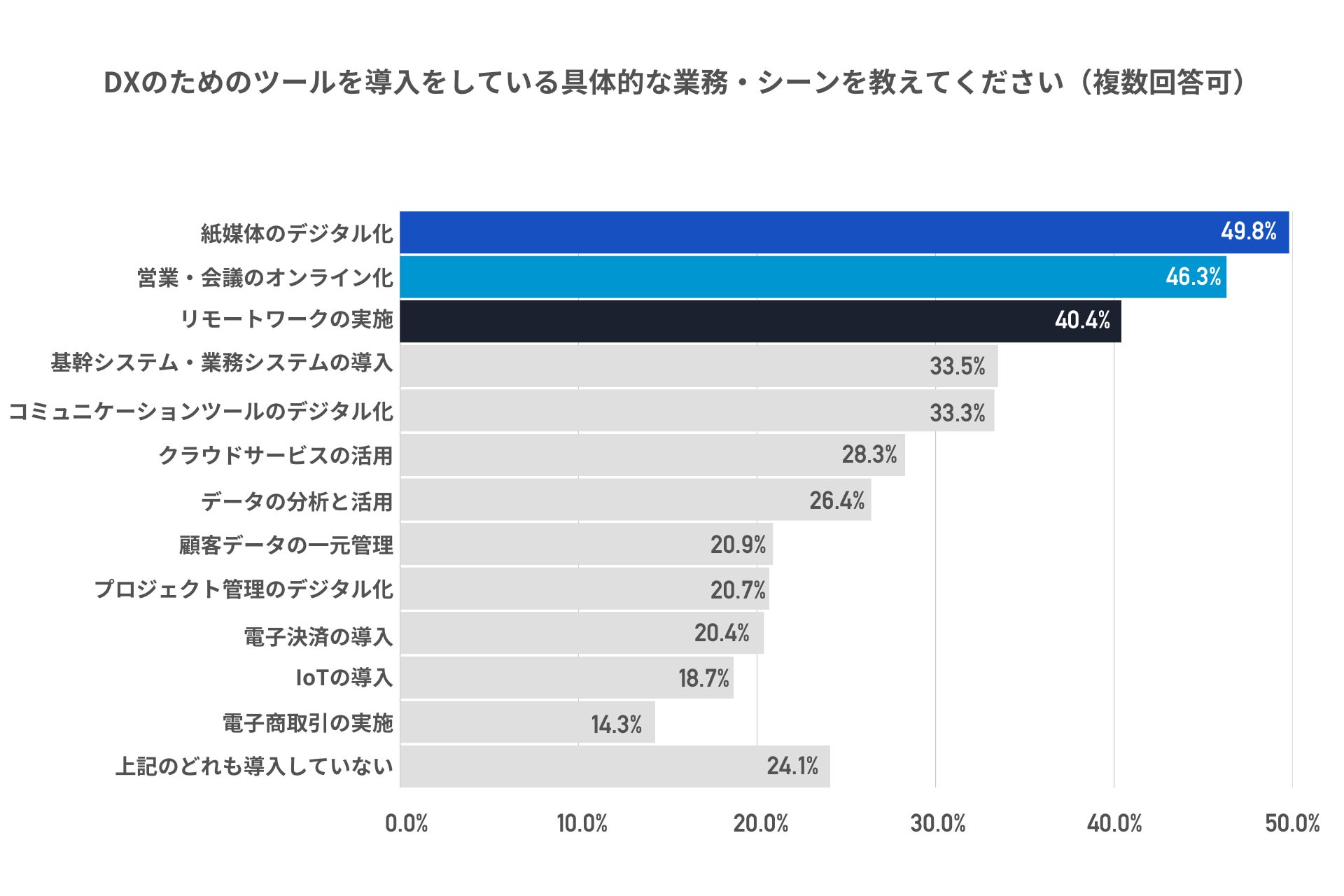 2)次に、DXのためのツール導入状況を確認したところ、「紙媒体のデジタル化」が49.8%、「営業・会議のオンライン化」が46.3%、「リモートワークの実施」が40.4%と回答。次に「基幹システム・業務システムの導入」は33.5%となった。