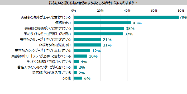 「美容師のカットが上手くなかった」「美容師の接客が良くなかった」が悪印象の要因として上位にきていることから、予約サイトで謳っている情報との差を感じさないような技術力やお客様の気持ちに寄り添った接客が大切なのではないでしょうか。