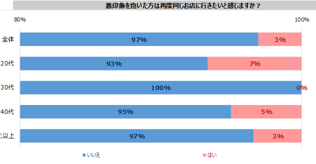 美容室においても来店前との印象差を感じた方のほとんどが悪印象のギャップでした。悪印象を受けた場合、98%の方が再来店はしないとしており、リピーター獲得は飲食店同様、悪印象を抱かせないことが重要ということがわかります。