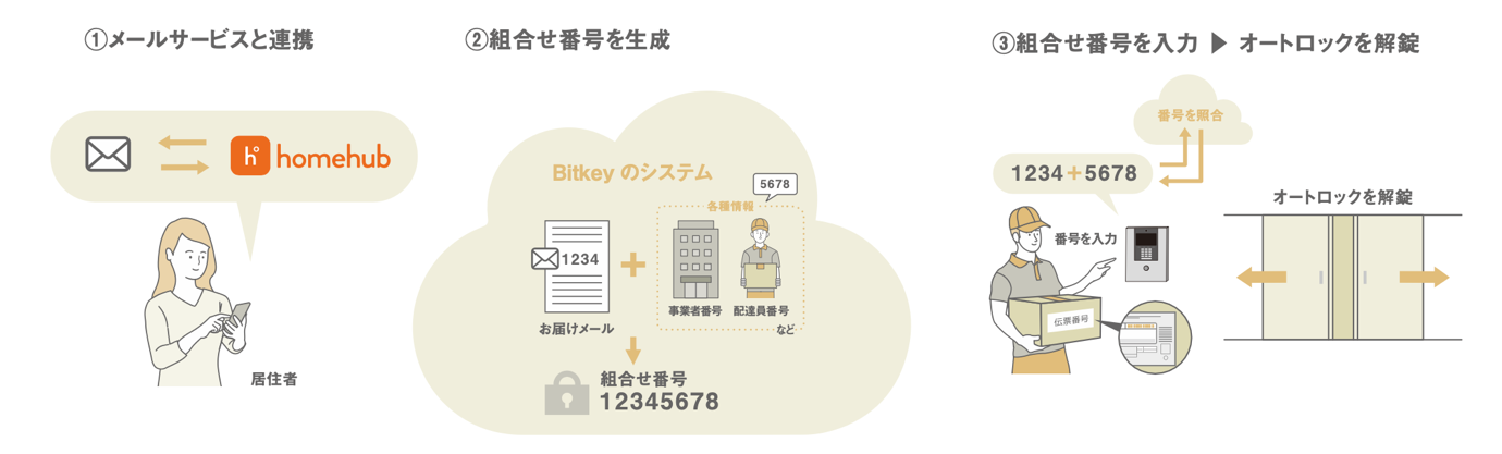 新機能は「homehub inHome Service」における「ドアマエ配達」の一環として、パナソニックより2023年11月より分譲マンションを中心に提案、2024年4月より提供開始を予定しています。ビットキーとパナソニックは新機能の提供を通じて、宅配事業者の負荷を軽減し、物流の2024年問題解決へ寄与してまいります。