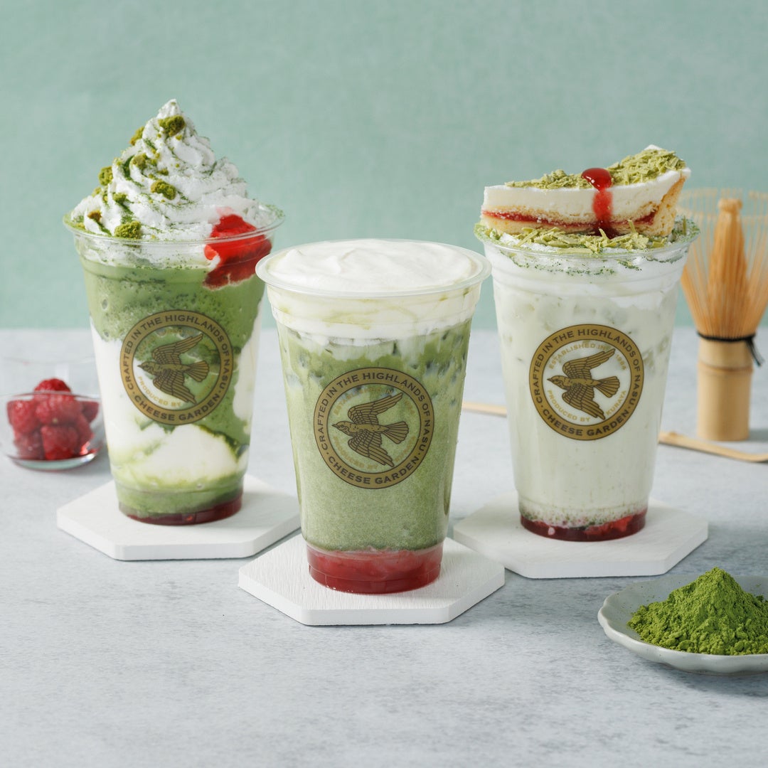 現在、一部のカフェ店舗にて、季節限定カフェドリンクメニュー『MATCHA DRINKS』を販売中です。フランボワーズソースを合わせた抹茶ラテに、ふんわりしたチーズフォームをのせたアイスラテや、レアチーズケーキ風味のドリンクにフランボワーズソースなどを合わせて、チーズガーデンこだわりのレアチーズケーキ「NASU WHITE フロマージュブラン」などをのせた、パフェのようなビジュアルも楽しめる飲むチーズケーキドリンク、チーズガーデンオリジナルのチーズフォームと抹茶フローズンをあわせたフローズンドリンクの3品をお楽しみいただけます。