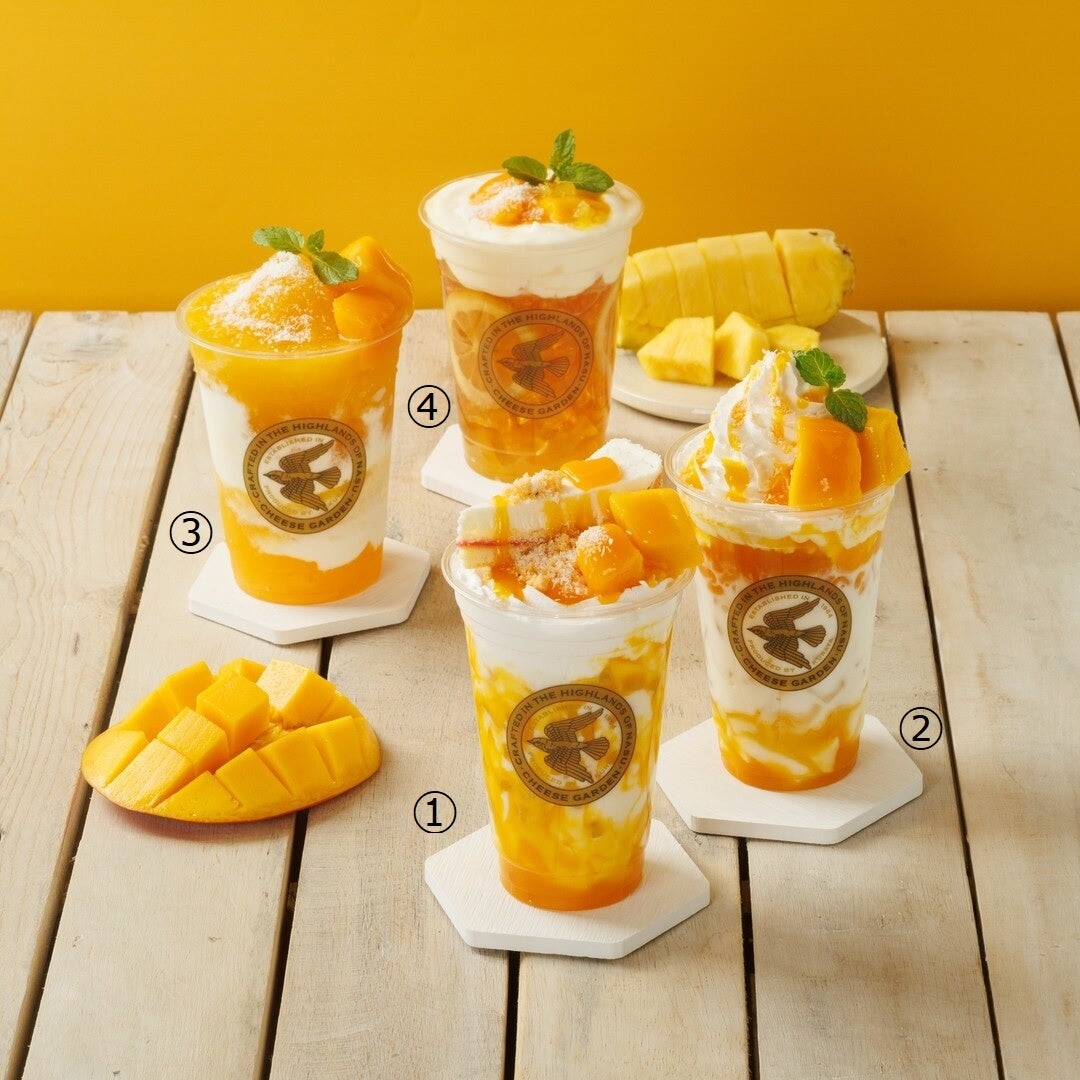 チーズガーデンこだわりのレアチーズケーキ「NASU WHITE フロマージュブラン」をトッピングした、パフェのようなビジュアルも楽しめる飲むチーズケーキドリンクや、人気のアジアンスイーツ杏仁豆腐とマンゴーやパイナップルのジュレやソースなどと組み合わせたトロピカルな味わいのチーズドリンク、那須本店に併設する工房で製造しているチーズフォームとマンゴーフローズンなどを合わせた、これからの季節にぴったりのフローズンドリンク、チーズガーデンオリジナルブレンドティー「手茶(てっさ)」の“御用邸”で淹れたストレートティーに、口当たりなめらかなチーズフォームを盛り込んだラテ風チーズドリンクの4品を販売いたします。