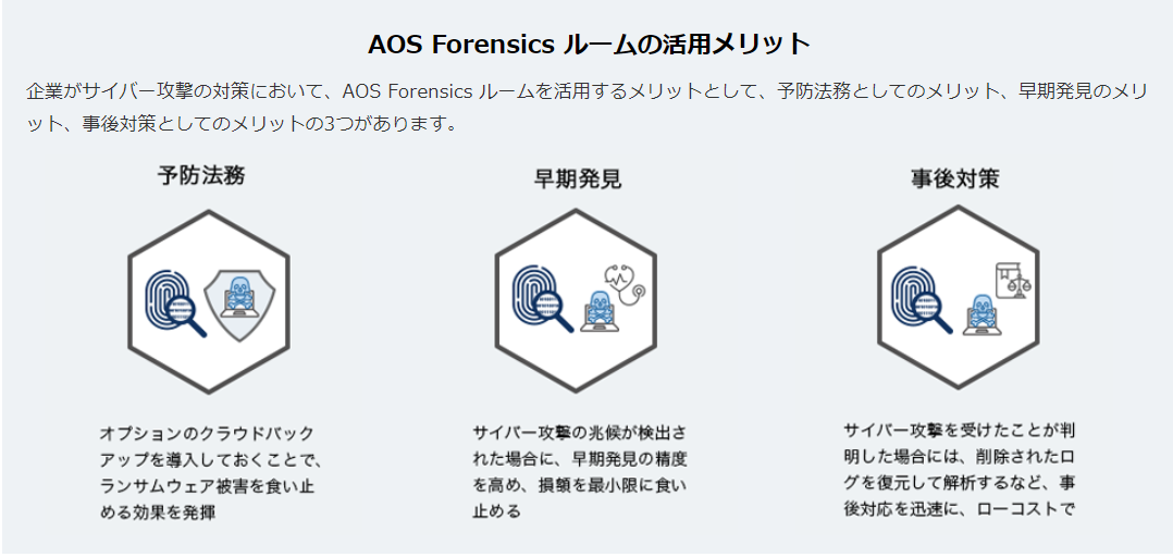 企業がサイバー攻撃対策において、AOS Forensics ルームを活用するメリットとして、予防法務としてのメリット、早期発見のメリット、事後対策としてのメリットの3つが期待できます。