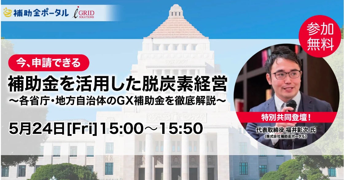 本セミナーには、全国の助成金・補助金情報を企業にとどけることに特化したシンクタンクカンパニー「補助金ポータル」と、20年以上にわたって脱炭素ソリューションの提供をしてきた「アイ・グリッド・ソリューションズ」が登壇します。 各業界の補助金活用事例・申請までの必要プロセス・抑えておくべきタイムラインについて、両社のそれぞれの実績と知見からお伝えします。