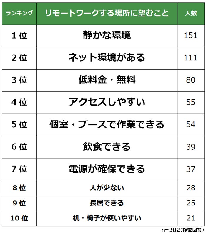 リモートワークする場所に求める条件としては「静か」「ネット環境がある」「低料金・無料」などがランクイン。