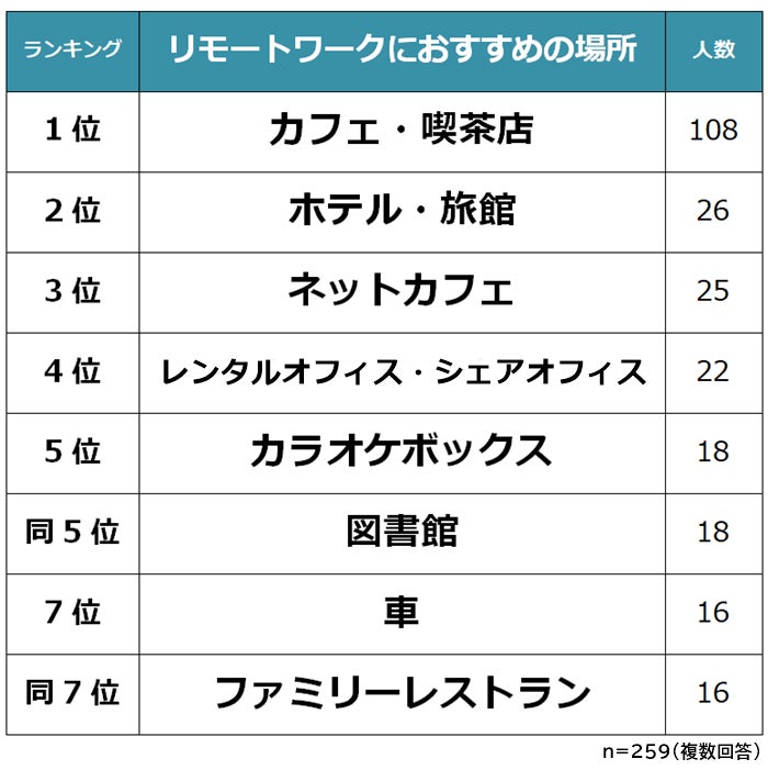 リモートワークにおすすめの場所ということで、1位にはカフェ・喫茶店、続いてホテルやカラオケなど有料の施設が上位にランクイン。その後に図書館や車といった無料で使える空間が続きます。