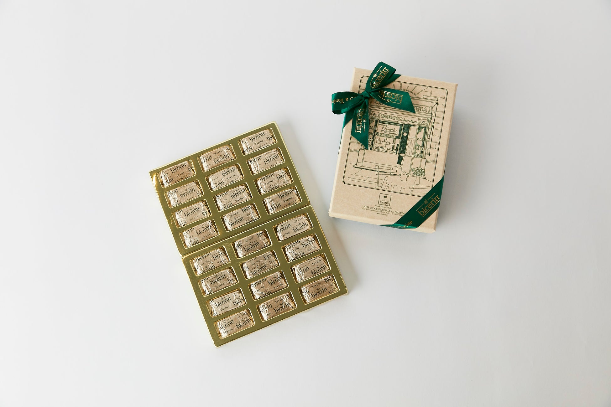 最高級のヘーゼルナッツペーストを練り混み、口どけ優しく風味豊かに仕上げた〈ジャンドゥイア・チョコレート〉をトリノ本店が描かれた特別なギフトボックスに詰め合わせました。