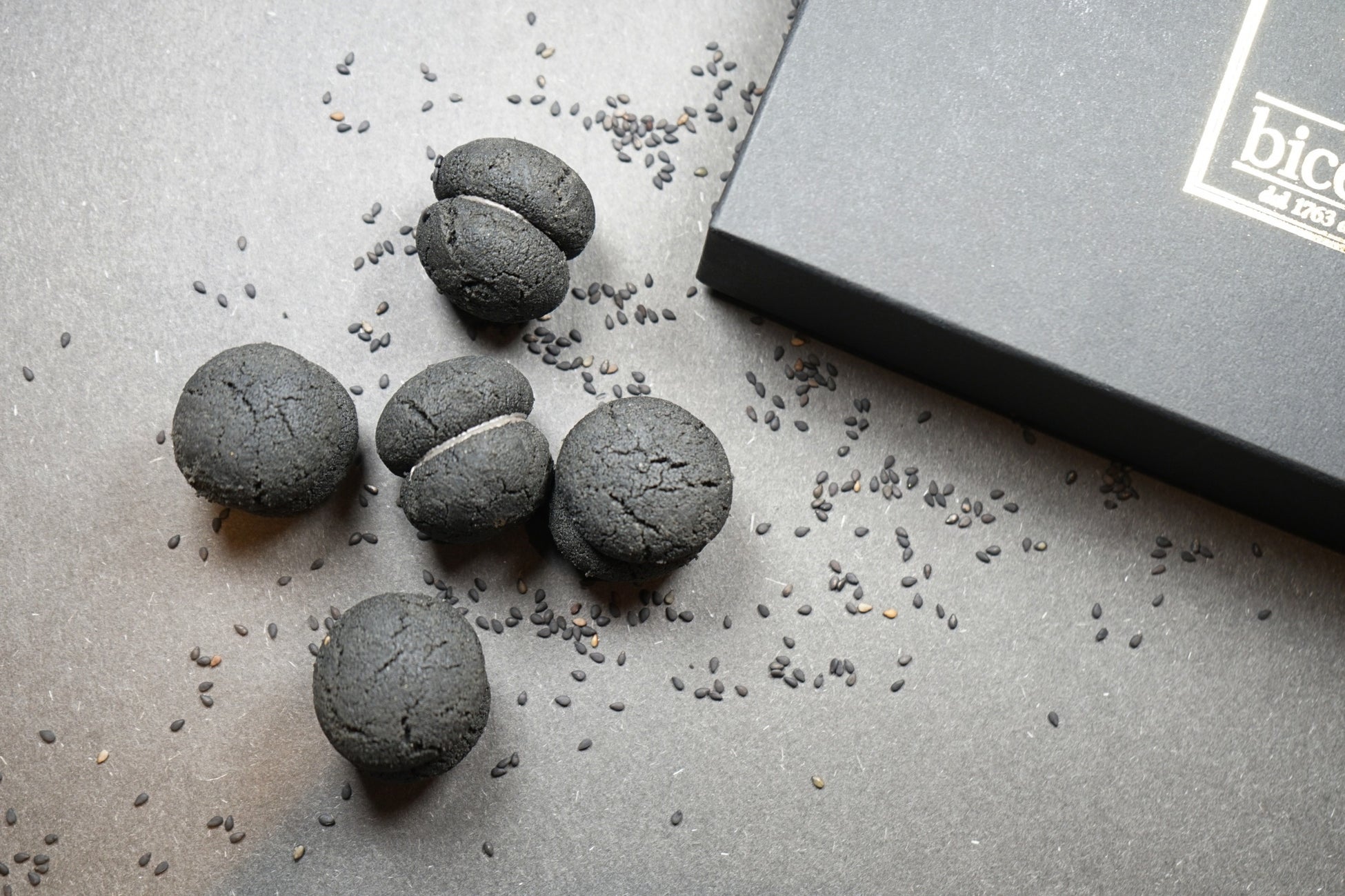 「バーチ・ディ・ダーマ」の漆黒デザインで、「ネロ」とはイタリア語で「黒」の意味。竹炭を練りこんだ黒いクッキー生地を使用し、間には黒ゴマペーストのクリームを挟み、一粒すべてを黒く焼き上げました。