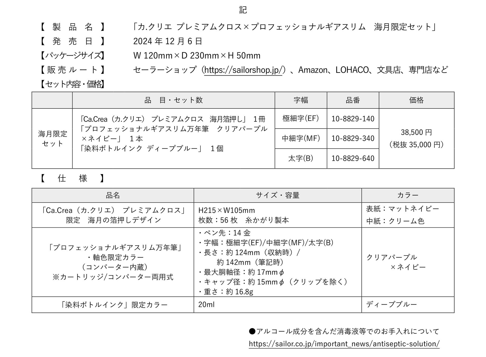 プラスとセーラー万年筆が共同運営している万年筆・文房具ギフトショップ「ancora(アンコーラ)」(https://www.ancora-shop.jp)では、アンコーラ限定バージョンの「海月セット」を数量限定で同時発売します。メーカー希望小売価格(税込)は、38,500円です。
