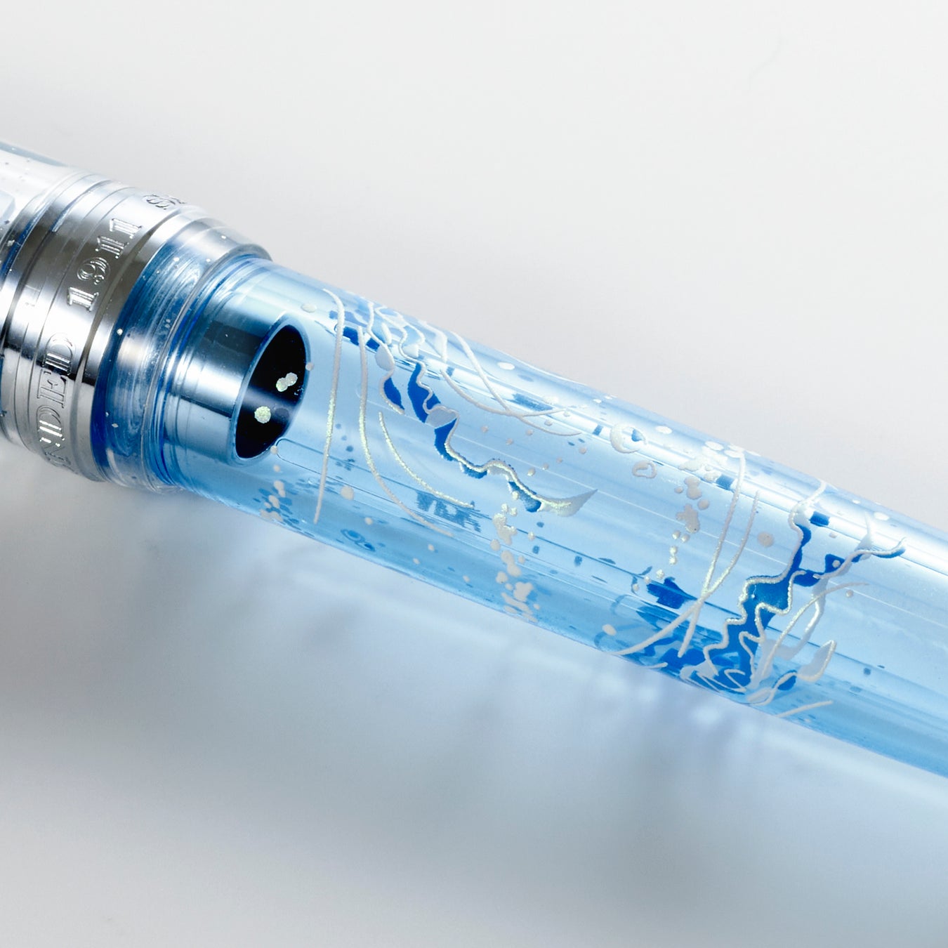 コラボレーション企画第8弾のテーマは“海月”。ノートには、暗い海の中をきらきらと光るクラゲをブルーの箔押しを施しました。万年筆は、海の深さを連想させるネイビーのボディ全体に、儚く光るクラゲをクリアパープルの蓋で表現。水のきらめきを思わせる細かいシルバーラメに、クラゲや水の流れをさりげなく感じさせる繊細なデザインで、14金のペン先にはクラゲと月を、蓋栓にはワンポイントでクラゲの頭をあしらいました。また、インクカラーは深い海の色をイメージしたディープブルーを新たに調色。ギフトボックスも海を連想させるブルーカラーでまとめました。まるで儚く消えてしまうような透明感と、暗い海の中できらきらときれいに輝くクラゲを感じていただける、幻想的なステーショナリーセットです。