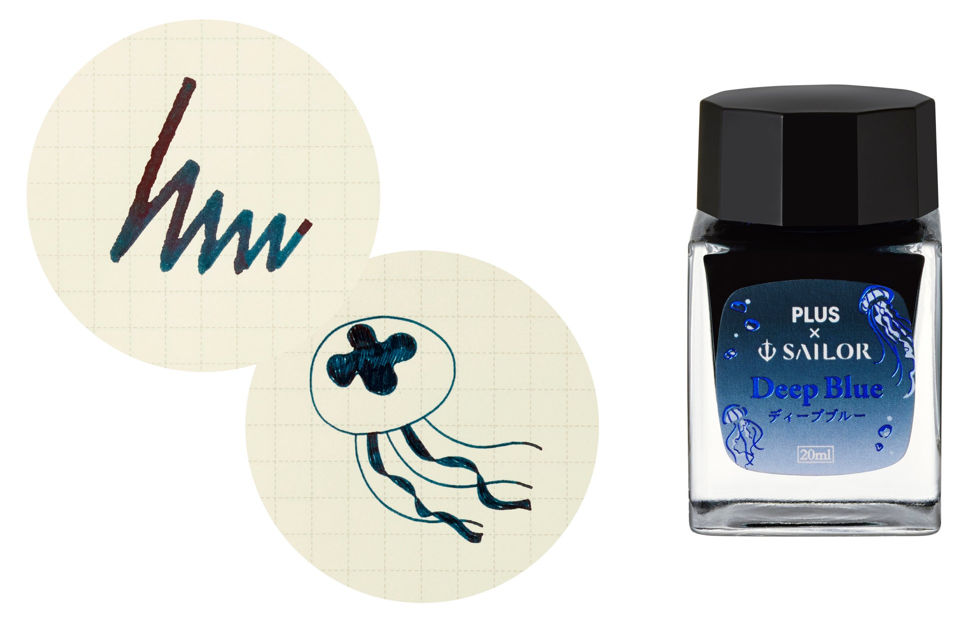深い海の色をイメージし、新たに調色した限定ディープブルーです。幻想的なブルーブラックは、ノートのクリーム色の中紙にもきれいに発色し、色の濃淡が楽しめます。また、ラベルはクラゲをイメージしたデザインにブルーの箔押しがあしらわれています。使い切りやすく、かわいらしい20mlのミニボトル入りです。