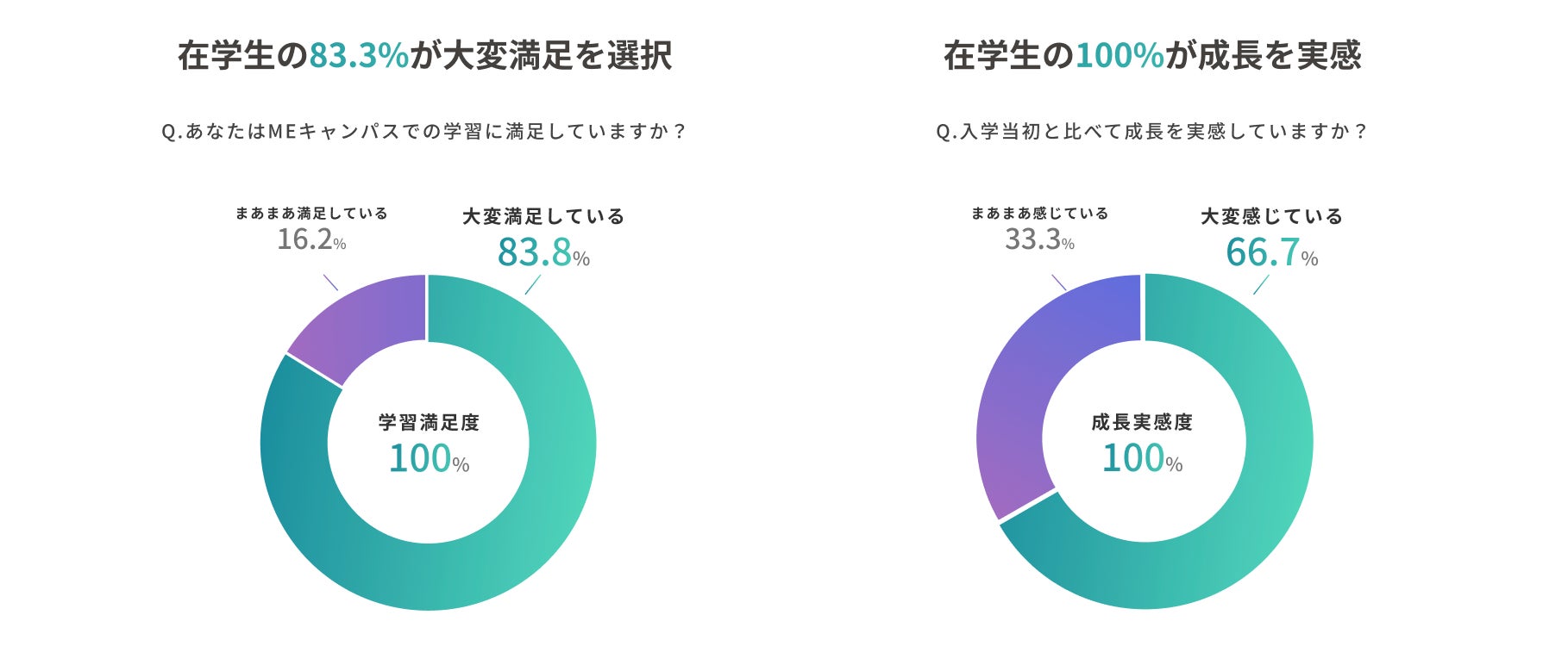 株式会社Edutainment-Lab(本社:東京都渋谷区、代表取締役:鵜沢 修平)が運営するMEキャンパス※は、2025年4月に在学生を対象とした満足度調査を実施しました。その結果、83.3%が「大変満足」、16.7%が「満足」と回答し、不満の声はゼロ。また「入学当初と比べて成長を実感している」と答えた学生は100%に達しました。