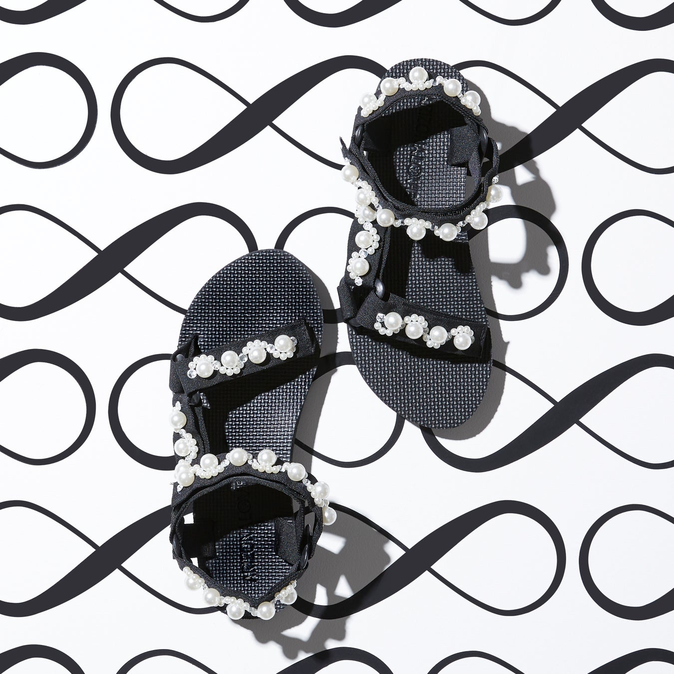 フランス人デザイナー レズリー・ハルフォン氏が手がける注目のシューズブランド<アリゾナ ラブ>。スポーツサンダルに大小さまざまなパールとビジューがデコレーションされた遊び心満点のモデルをバーニーズ ニューヨーク限定のブラックでオーダーしました。キラキラと輝く足元は、着こなしに一足早い夏のムードを演出します。驚くほど軽いソールは、クッション性も高く、履き心地抜群。ほどよくインパクトのある足元でコーディネートに個性をプラスします。
