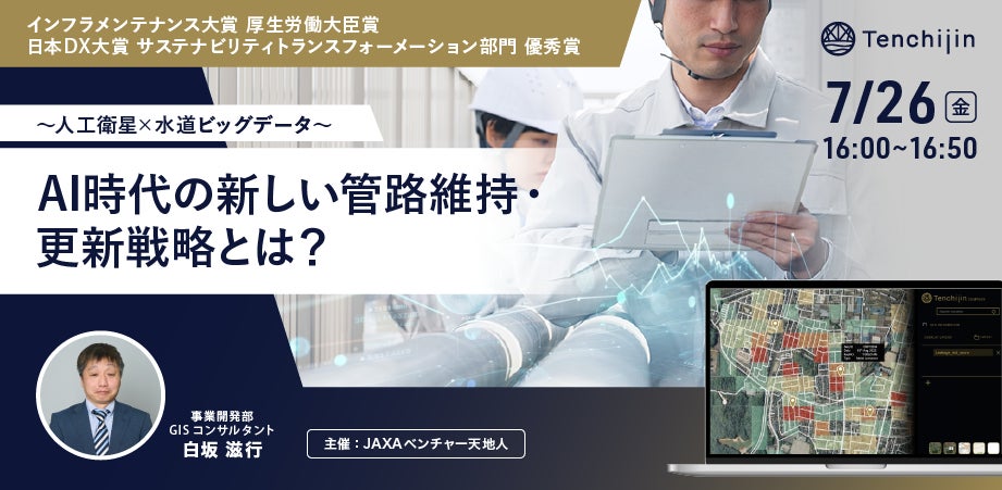 本セミナーでは「人工衛星×水道ビッグデータ×AI戦略」をテーマに、「天地人コンパス 宇宙水道局」の活用事例をご紹介いたします。「AI時代の到来」で水道管路の維持・更新業務の生産性はどこまで高められるのでしょうか。漏水調査や管路更新において、データを武器として活用するための方法にご関心をお持ちの自治体職員さまのご参加をお待ちしております。